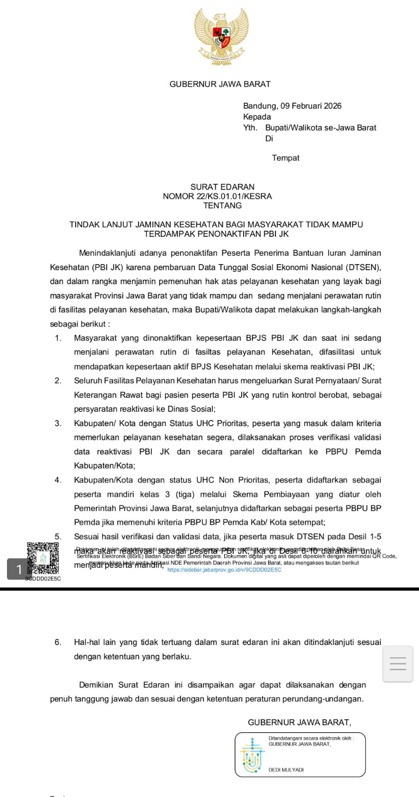 Surat Edaran Gubernur Jawa Barat terkait Tindaklanjut Penonaktifan KIS